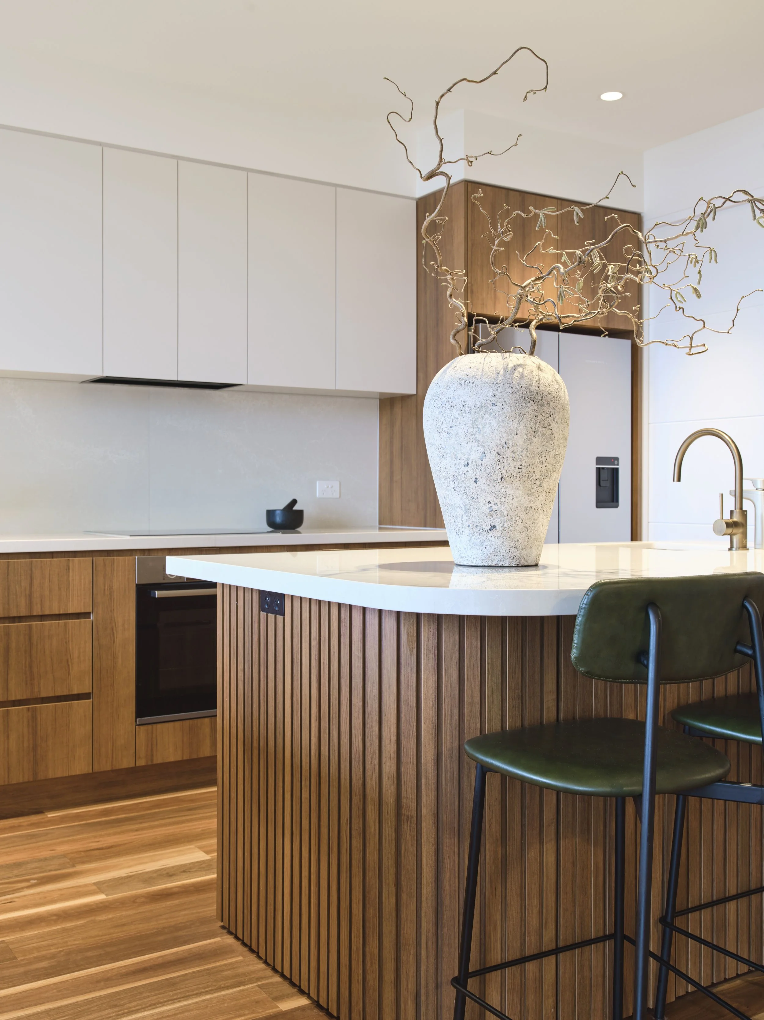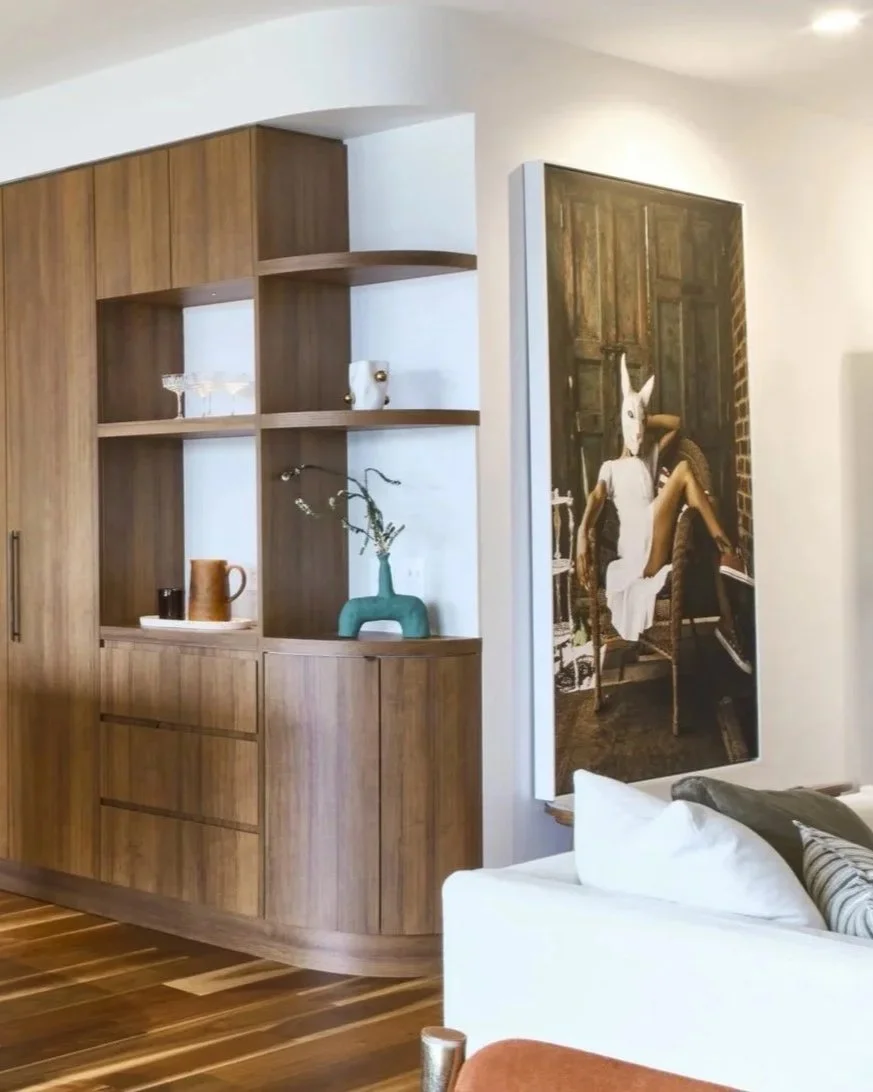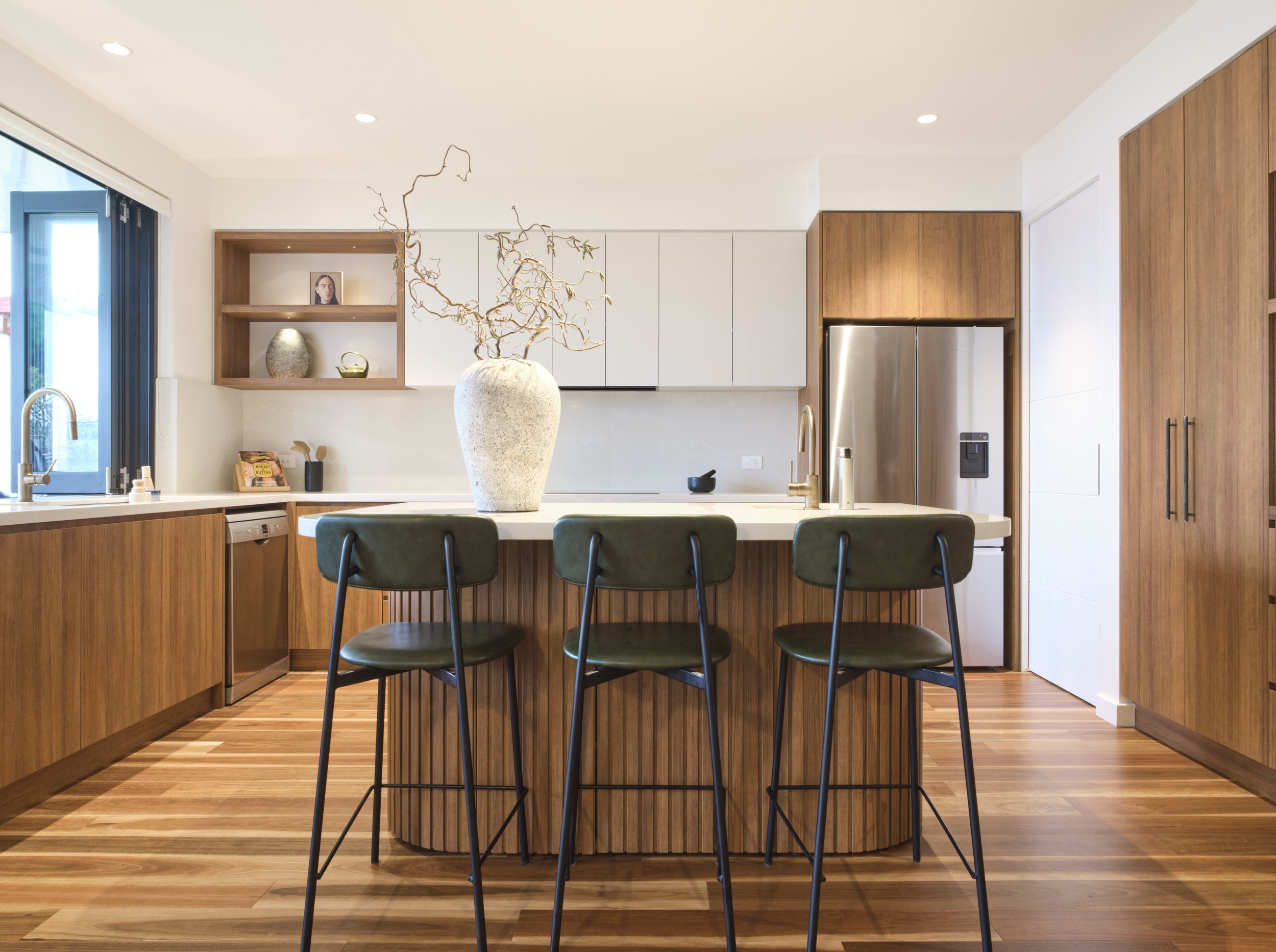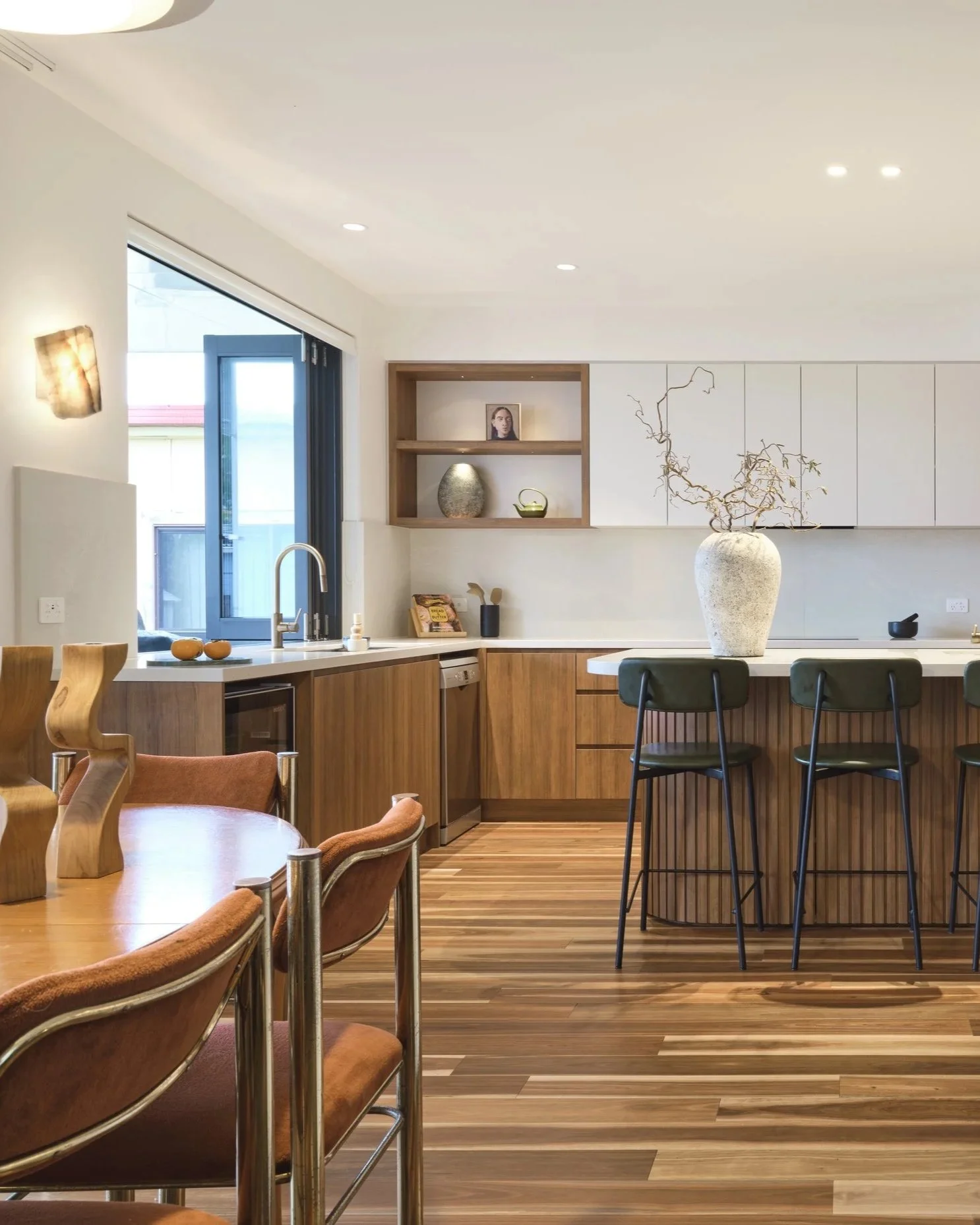 Warm materials, brave choices & an open minded approach allowed the clients existing furniture, music station & collections to sit naturally within the new architecture and create a layered & deeply personal space.